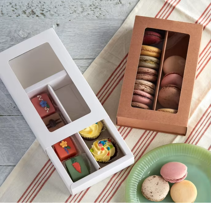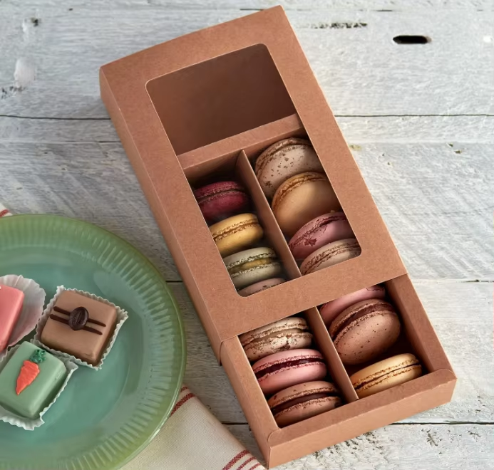 - ◦ The interior is usually designed with a partitioned structure ( such as independent grooves ) to fix macarons , preventing collision damage during transportation and maintaining the dessert's complete shape .